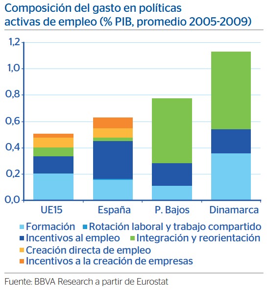 Sin embargo, incluso aunque admitamos que otros estados dedican más dinero a esta cuestión, no parece que sólo esa pequeña diferencia sea suficiente para explicar la enorme brecha que separa las tasas de paro de España y sus vecinos. Porque el problema no es sólo de gasto total, sino de en qué cómo se gasta.