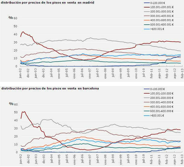 Sin embargo, la caída del valor de la vivienda les ha situado como la franja de precios más común tanto en Madrid como en Barcelona. De hecho, 3 de cada 10 viviendas en ventas tanto en Madrid como en Barcelona tienen un precio de oferta de entre 100.000 y 200.000 euros.