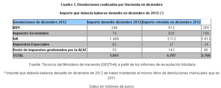 Gestha atribuye este empeoramiento de las cuentas públicas al retraso sin precedentes en el pago de las devoluciones previstas en diciembre de 2012, si se compara con las devoluciones realizadas en ejercicios anteriores. En total, Hacienda transfirió en diciembre a los contribuyentes 2.766 millones de euros menos de los que habría devuelto el año anterior de seguir el criterio de entonces una cantidad que equivale a casi tres décimas del PIB.