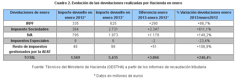 Según los Técnicos de Hacienda, este "movimiento deliberado de la AEAT" explica que los datos de recaudación de enero arrojen un inusual incremento de las devoluciones en este mes, sobre todo en aquellas relacionadas con el Impuesto de Sociedades (+611,1%), IVA (+148,2%) e IRPF (+86,7%).
