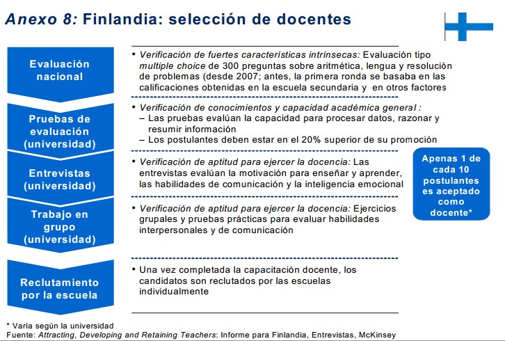 - Selección: el proceso debe ser exigente y atrayente. Los sistemas con mejor desempeño reclutan a los candidatos "en el primer tercio de cada promoción de graduados de sus sistemas educativos: el primer 5% en Corea del Sur, el 10% superior en Finlandia y el 30% superior en Singapur y Hong Kong". Es decir, que los mejores estudiantes de estos países quieren ser maestros. Es una profesión demandada y muy valorada por la sociedad.