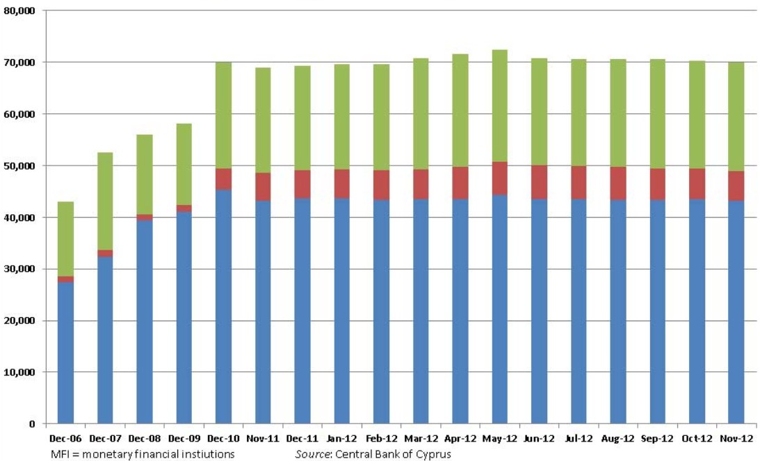2. A diferencia de otros sistemas financieros, la principal vía de financiación de la banca chipriota son los depósitos, sobre todo, procedentes de otros países, y ha sido esta acumulación de pasivos la que explica en buena medida el desmesurado crecimiento de su banca. En este sentido, la deuda subordinada y senior de las entidades chipriotas apenas alcanza los 2.000 millones de euros, lejos de los 5.800 millones en participación privada que requiere la troika. De un total de 68.000 millones en depósitos, 43.000 son de residentes en Chipre y cerca de 20.000 millones de países de fuera de la zona euro, principalmente rusos.