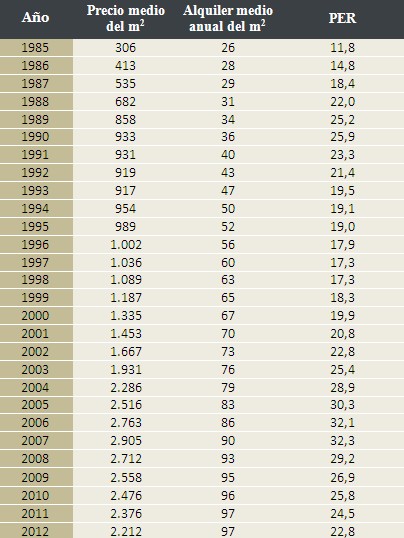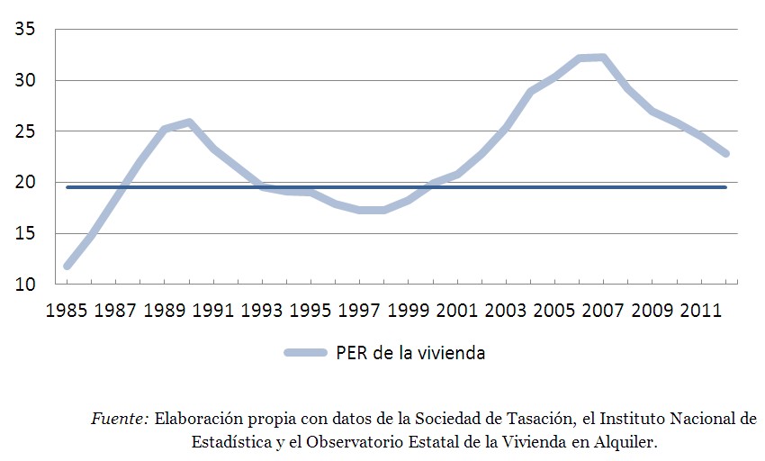 El precio medio del metro cuadrado de la vivienda en España se situó a finales de 2012 en 2.212 euros. Mientras, el alquiler medio por metro cuadrado y año costaba 97 euros. Esto quiere decir que, a finales del pasado año, el PER de la Vivienda (número de años que se necesitaría alquilar un inmueble para recuperar el monto inicial de la inversión) se situó en 22,8. Esta cifra está aún muy alejada del 19,5 (que refleja el promedio desde 1985 hasta 2001, año en el que podríamos situar el comienzo de la burbuja de precios inmobiliarios), aunque es cierto que ha caído sustancialmente respecto al 32,3 que marcaba en 2007.