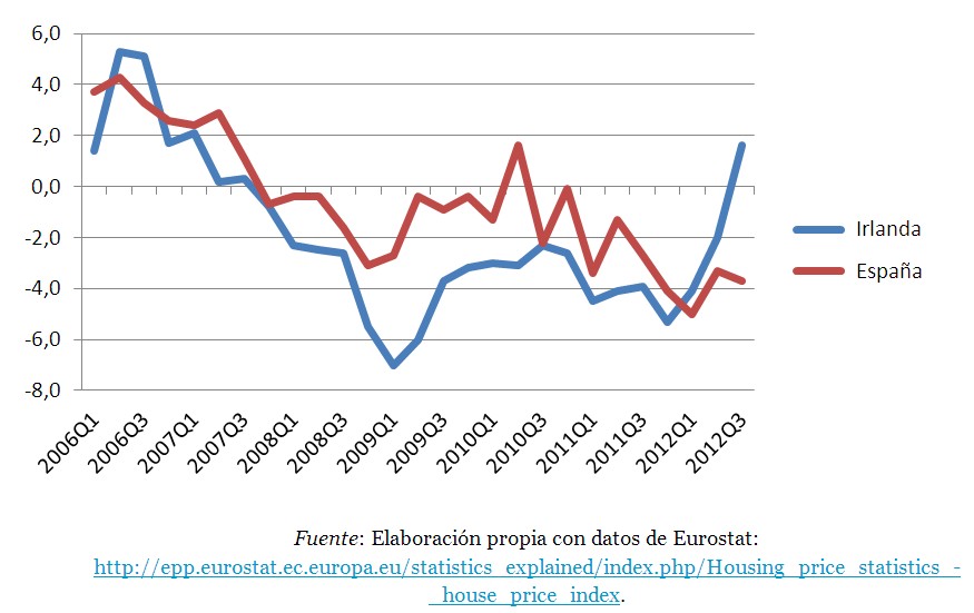 La lentitud del ajuste del caso español contrasta con el rápido ajuste de otros países europeos que también experimentaron burbujas inmobiliarias de magnitudes considerables, como Irlanda o, aunque más difícilmente comparables, los países bálticos. A modo de ilustración, en el siguiente gráfico se observa la evolución de la tasa de variación trimestral del precio de la vivienda en España e Irlanda desde 2006 hasta el tercer trimestre de 2012 (último dato disponible):