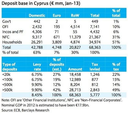 El plan de rescate inicial contemplaba una quita del 6,75% sobre los depósitos de menos de 100.000 euros (2.100 millones) y del 9,9% sobre los superiores (3.700 millones) para recaudar los 5.800 millones de euros en acciones bancarias que exige la troika. Este reparto, impuesto por el propio Gobierno chipriota, cargaba casi el 40% de la factura sobre los pequeños ahorradores y el resto sobre los depósitos no garantizados, tal y como muestra el siguiente gráfico elaborado por Barclays.