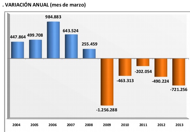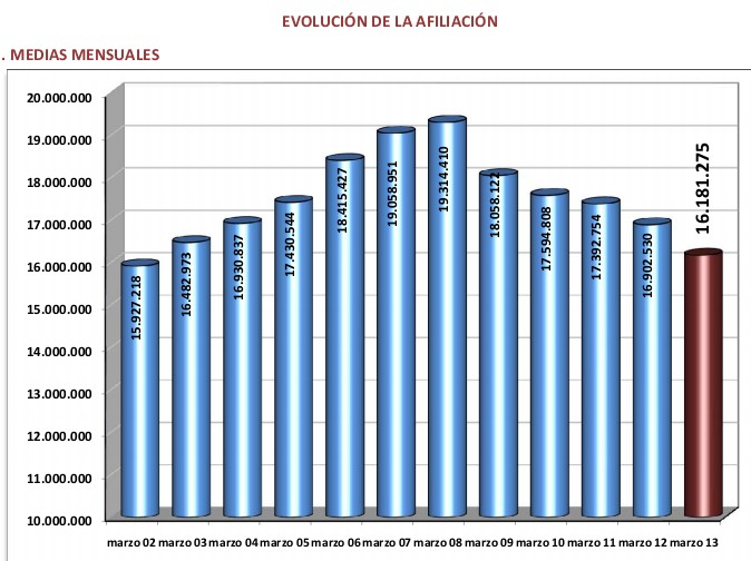 Pese a todo, dentro de lo malo, los datos correspondientes al último día de cada mes muestran que la afiliación en el primer trimestre de 2013 ha sufrido una caída de 162.674 personas respecto al pasado diciembre, inferior a la del mismo período de 2012 (-226.033), en línea con la de 2011 (-152.696) y 2010 (-160.570) y muy por debajo del desplome sufrido en los tres primeros meses de 2009 (-338.326).
