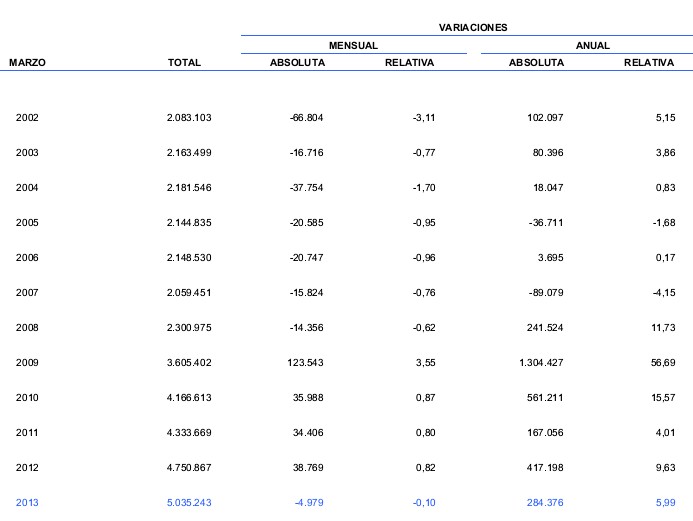 En marzo de 2009, el paro se incrementó en más de 123.000 personas, mientras que en los mismos meses de los años 2010, 2011 y 2012 subió en más de 30.000 personas. Para encontrar un descenso hay que remontarse a marzo de 2008, cuando el desempleo bajó en 14.456 personas. Desde el inicio de la serie histórica, que arranca en 1996, el paro ha disminuido en todos los meses de marzo, salvo en los del periodo 2009-2012.