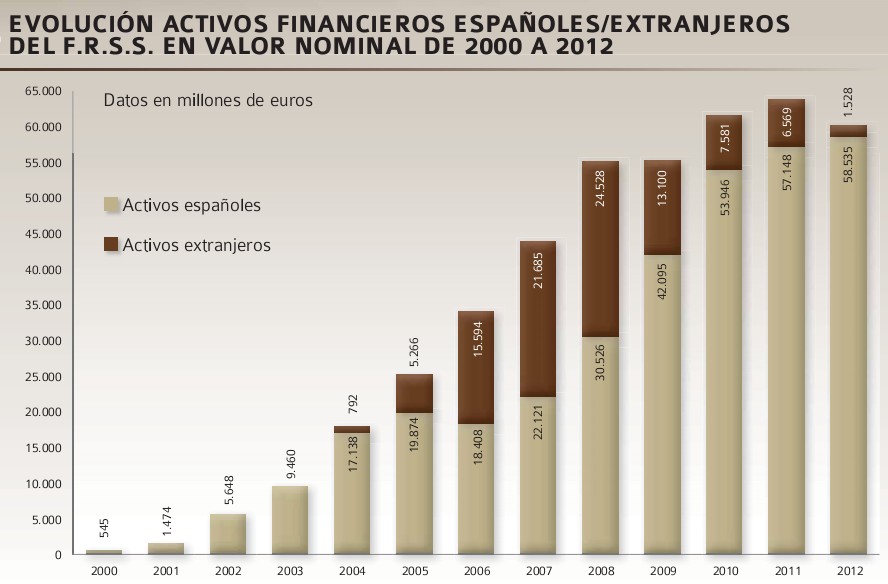 Así, mientras que en 2008 apenas el 55% del Fondo estaba invertido en deuda nacional y el 45% restante en extranjera, en 2009 se elevó al 76%, en 2010 al 88%, en 2011 al 90% y en 2012 el 97%. Desde 2008, se ha ido desprendiendo progresivamente de deuda extranjera (de alta calidad) para comprar deuda española (de baja calidad y, por tanto, con mayor riesgo de impago). Ahora, tan sólo el 2,5% de la cartera está invertido en bonos extranjeros: el 45,46% se encuentra depositado en deuda francesa, el 43,69% en deuda alemana y el 10,85% en deuda holandesa.