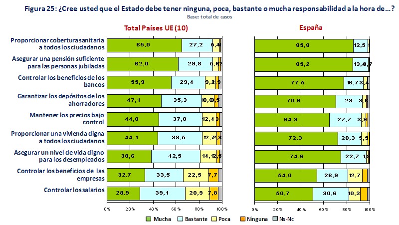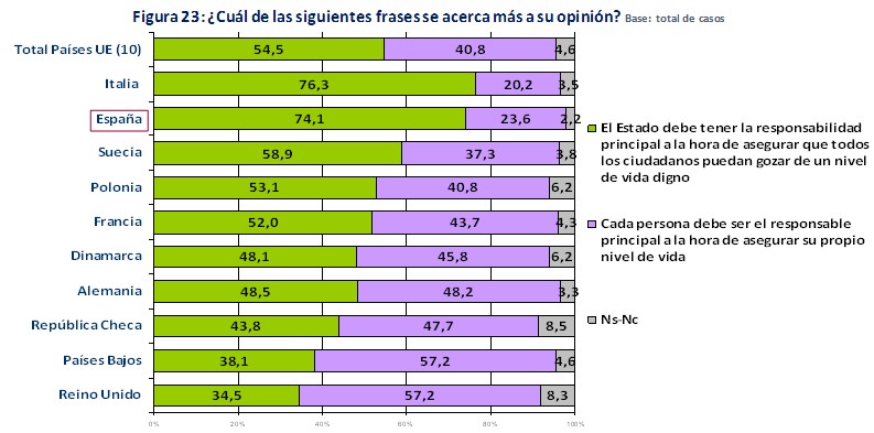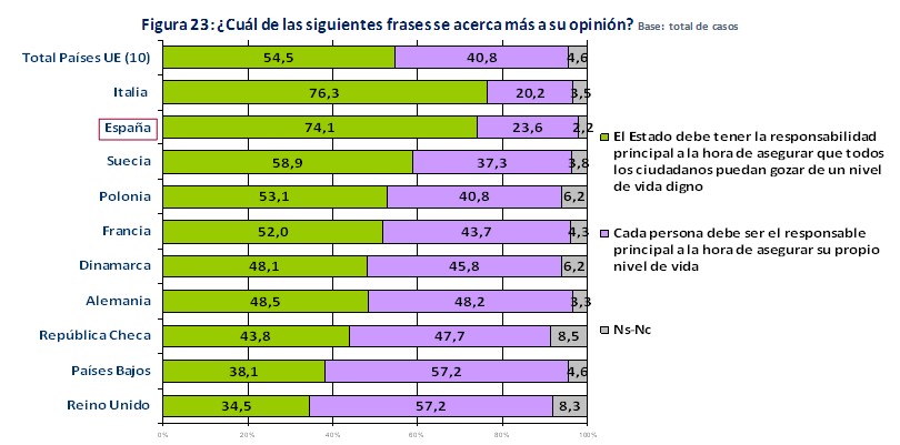 De hecho, aunque todos los europeos atribuyen un papel central al Estado en el control de la economía, las opiniones se dividen respecto a quién tiene la responsabilidad principal de asegurar un nivel de vida "digno" a los ciudadanos: España, junto a Italia, son los países en donde una muy amplia mayoría cree que el Estado debe tener esa responsabilidad. Por el contrario, en Reino Unido y Países Bajos la mayoría cree que cada persona tiene la responsabilidad principal en asegurar su nivel de vida.