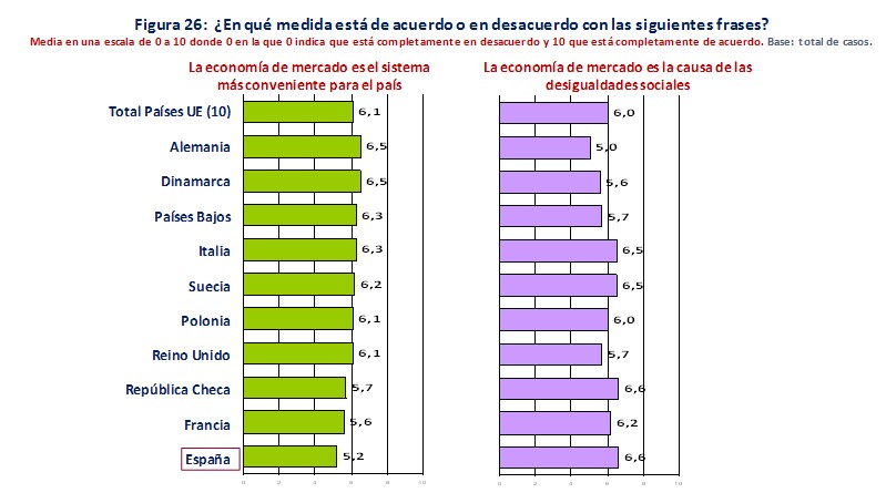 Por otro lado, el estudio revela que la media de acuerdo con la idea de que "la economía de mercado es el sistema más conveniente para el país" supera los 6 puntos en una escala de 0 a 10. Aun así, la mayoría también percibe que "la economía de mercado es la causa de las desigualdades sociales", alcanzando 6 puntos de media en el promedio europeo.