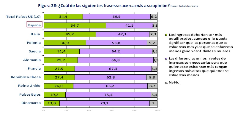 España, sin embargo, se aleja de la posición europea, con una mayoría (55%) que aboga por ingresos más equilibrados con independencia del esfuerzo personal frente al 42% que cree que los ingresos deberían diferenciarse en función del esfuerzo).