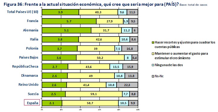 Pero de nuevo en España predomina especialmente la preferencia por mantener o aumentar el gasto público para estimular el crecimiento, con un 59% de los encuestados frente al 2,1% que defiende los recortes de gasto público (políticas de austeridad) para reducir el déficit y la deuda. En este sentido, los españoles son los que menos se decantan por hacer ajustes para combatir la crisis.