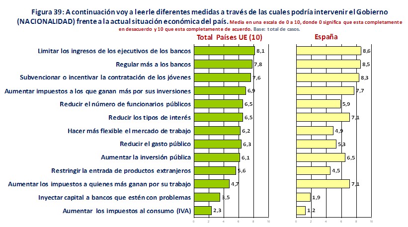 De media, los españoles son más partidarios de que los gobiernos intervengan en diversos ámbitos de la economía para superar la crisis, desde limitar los ingresos de los ejecutivos de los bancos, hasta regular más a los bancos, incentivar la contratación laboral de los jóvenes o aumentar los impuestos a quienes más ganan por sus rendimientos de capital.