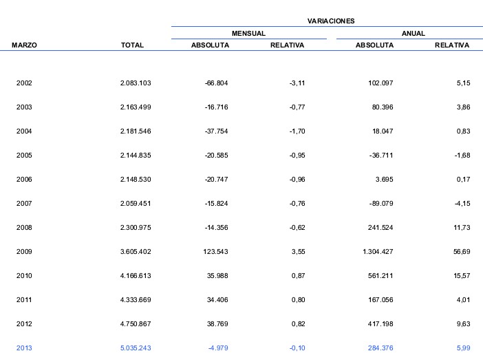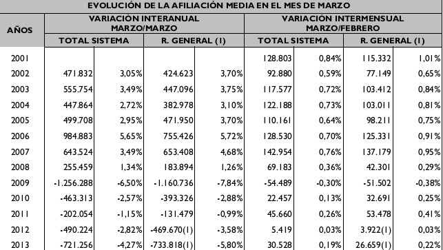 Sin embargo, la afiliación media a la Seguridad Social (incluyendo el efecto estacional) ha acumulado en los últimos doce meses un descenso de 721.256 cotizantes (-4,27%), un ritmo de destrucción laboral muy superior al del mismo mes de 2012 (-2,82%) y la mayor caída interanual en un mes de marzo desde 2009.