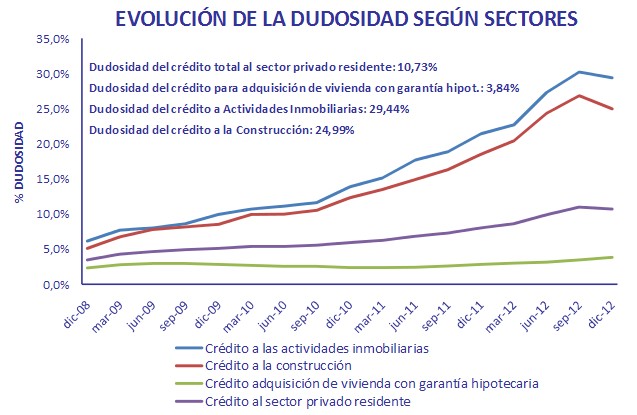 En primer lugar, la morosidad hipotecaria cerró en el 3,84% en 2012, lo cual significa que tan sólo cuatro de cada 100 hipotecados han dejado de pagar sus cuotas, a pesar de la elevada tasa de desempleo y la larga crisis económica que azota el país desde 2008.