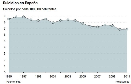 De hecho, la tasa de suicidios por cada 100.000 habitantes no ha dejado de caer en la última década, incluso en plena crisis, hasta situarse en niveles mínimos de la serie histórica comparable, que arranca en 1995. En 2007, en plena burbuja inmobiliaria, la tasa de suicidios era superior a la actual, y España se mantiene hoy en día como uno de los países con menos suicidios de toda la UE.