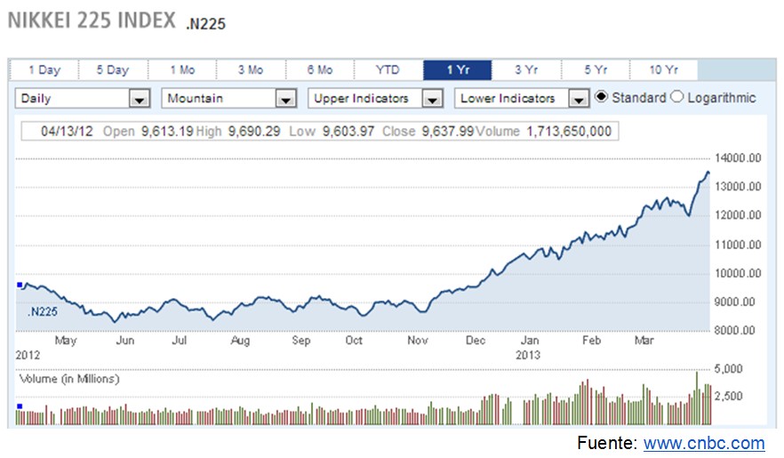 ¿Y cómo responden las Bolsas a cada noticia de un nuevo Twist, Quantitative Easing o inyección de liquidez monetaria? Pues las propuestas del primer ministro japonés Abe, de las que ya hablamos aquí, han sido recibidas con considerables subidas en el Nikkei, el Ibex nipón.