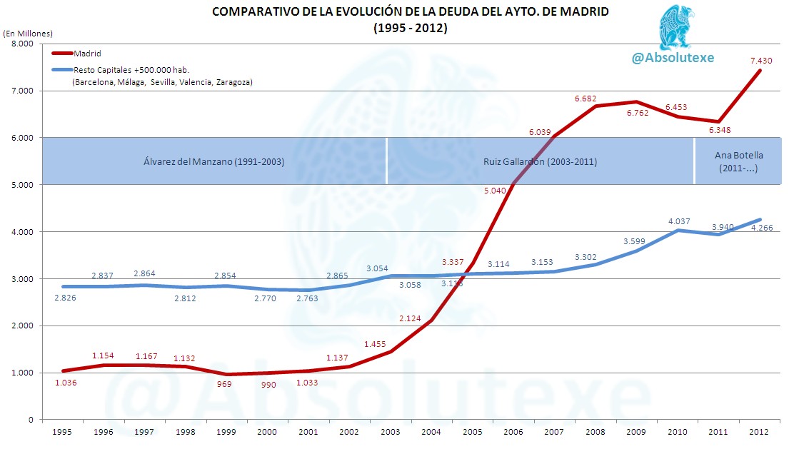 Esos cerca de 1.000 millones de deuda extra fueron el colofón de la gestión financiera de Gallardón, tras años de despilfarro y números rojos al frente del ayuntamiento. No en vano, cuando llegó a la alcaldía de Madrid (2003) la deuda del consistorio apenas ascendía a 1.455 millones de euros, pero cuando abandonó el cargo (2011) ya ascendía a 6.348, casi cuatro veces más.