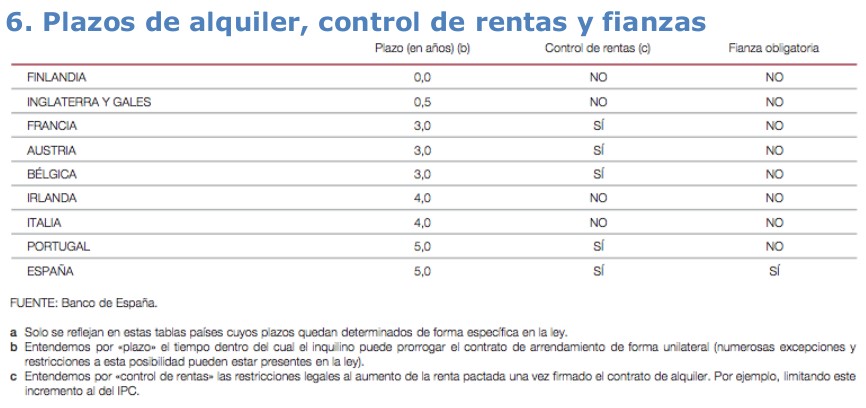 Entre los factores de inseguridad jurídica que tienen en cuenta los propietarios destaca el hecho de que "España es uno de los países con un mayor plazo de prorrogación del contrato de alquiler, hasta 5 años (aunque se encuentra en trámite parlamentario la reducción a 3 años)". También es de los pocos países en los que existe una fianza mensual obligatoria.
