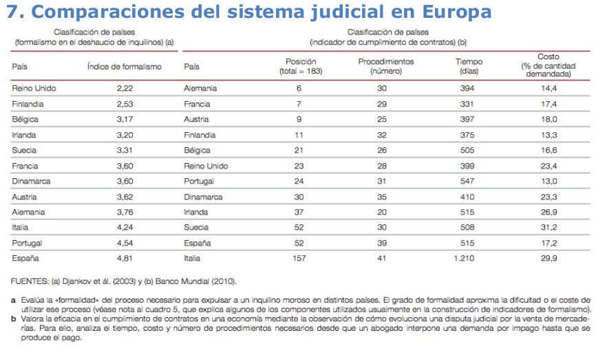Además, España registra uno de los mayores índices de "formalismo", lo cual se traduce en muchas más dificultades para que los propietarios puedan expulsar a los inquilinos morosos, en comparación con el resto de Europa. A ello se suma el hecho de que España se sitúa en puesto 52 del ranking mundial en cuanto a cumplimiento de contratos, con un farragoso procedimiento judicial, de elevado coste económico, en caso de que surjan problemas con el pago del alquiler.