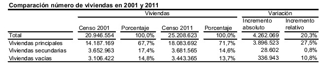 La atención mediática se ha centrado en el llamativo número de viviendas vacías, dada la fuerte polémica que ha surgido en los últimos meses en torno al tema de los desahucios hipotecarios. Sin embargo, aunque 3,44 millones pueda parecer una cifra muy elevada, en realidad, el volumen de inmuebles desocupados ha descendido en términos relativos en los últimos diez años, al pasar del 14,8% del total de viviendas en 2001 al 13,7% en 2011. Además, esta cifra está muy alejada de los 6 millones de pisos vacíos que se llegaron a barajar en los últimos meses.