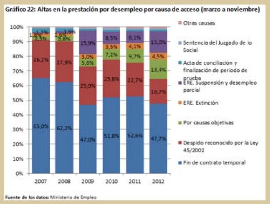 Lo sorprendente es que un 16,7% de los nuevos parados con derecho a prestación en 2012 lo fueron a través de despido improcedente (desde un 22,7% en 2011, eso sí). ¿Qué está pasando? ¿Es que los empresarios no quieren ahorrarse parte del coste de las indemnizaciones? La diferencia es muy grande: de 20 días por año con 12 meses de máximo a 33 días con 24 meses (e incluso, 45 días con 42 meses para los que ya hubieran acumulado esos derechos). Ahora que no hay salarios de tramitación, no tendría mucho sentido. Podríamos decir que hay dos posibles explicaciones: