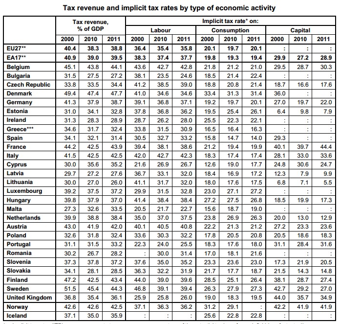 - Tipos muy elevados: en IRPF, Sociedades e IVA los tipos generales fijados por ley están entre los más altos de Europa, como puede verse en el cuadro publicado el lunes por Eurostat (ver imagen, hacer click para ampliar).