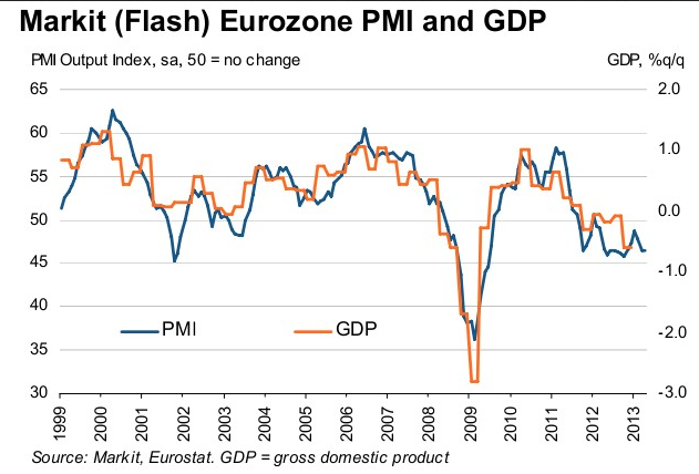 A ello se suma la recesión que sufre ya buena parte de Europa. El último indicador al respecto es el declive de la producción manufacturera publicado este jueves por Markit. El índice PMI del sector manufacturero volvió a contraerse con fuerza en la zona euro el pasado abril, hasta situarse en 46,7, el nivel más bajo en cuatro meses. Un índice situado por encima de 50 indica expansión y por debajo recesión. De hecho, la producción alemana se contrajo por primera vez este año, uniéndose a las habituales desaceleraciones del resto de países del área del euro.