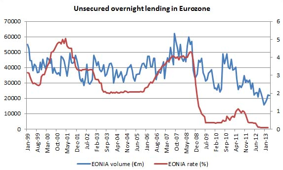 Sin embargo, este argumento ha fallado estrepitosamente en el pasado y nada augura que estas nuevas medidas vayan a provocar un efecto distinto. En primer lugar, el mercado interbancario, en donde los bancos se prestan dinero entre sí, sigue congelado. La banca europea no se presta dinero (con la excepción de entidades muy sólidas), a pesar de que el interés interbancario ya está en mínimos históricos, debido a los problemas de insolvencia financiera que persisten en la zona euro.