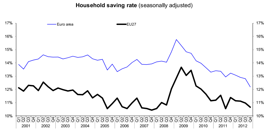 La crisis, la moderación salarial y las subidas de impuestos han reducido la tasa de ahorro en Europa y EEUU hasta nuevos mínimos históricos, según los últimos datos oficiales. En concreto, la tasa de ahorro de los hogares en la zona del euro bajó hasta el 12,2% de su renta disponible en el cuarto trimestre de 2012, una reducción de seis décimas respecto al trimestre precedente, según Eurostat. Se trata del nivel de ahorro más bajo registrado desde la creación de la moneda única.