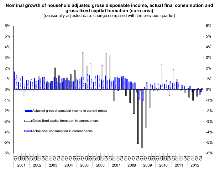 En concreto, la mayor caída de la renta disponible de los hogares españoles se registró en el último trimestre de 2012 (coincidiendo con la última subida de impuestos), lo cual también se tradujo en un descenso del consumo, tal y como muestra el siguiente gráfico de Eurostat.