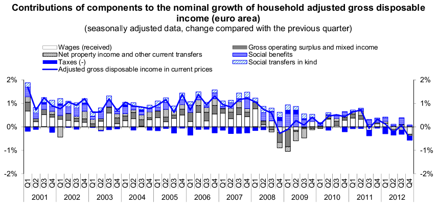 El aumento de la carga fiscal supuso en 2012 el mayor impacto negativo sobre la renta disponible de los hogares desde 2007, con la diferencia de que entonces los salarios subían en lugar de bajar, compensando así la mayor tributación. La devaluación interna -ajuste relativo de precios y salarios- que experimentan las economías más débiles de la zona euro y los aumentos generalizados de impuestos para tratar de reducir el déficit público se materializaron en una caída de los ingresos familiares y, por tanto, de la capacidad de ahorro en 2012 hasta un nivel inédito desde la creación de la moneda única.