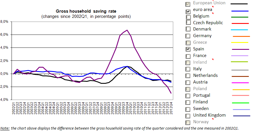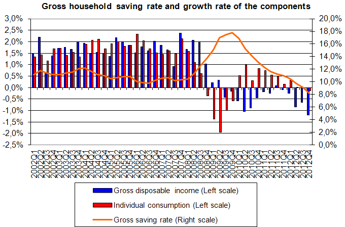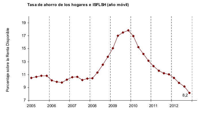 En este ámbito destaca especialmente la situación de España, en donde los ingresos familiares no han dejado de decrecer desde mediados de 2009, un proceso agravado por la histórica subida de impuestos aprobada durante la crisis, momento a partir del cual la tasa de ahorro de las familias se ha hundido hasta situarse en el 8,2% de su renta disponible en 2012 (media móvil), un retroceso interanual de nueve décimas y un mínimo histórico desde que existen datos comparables (año 2000).