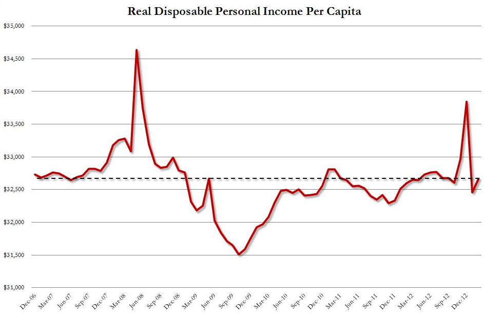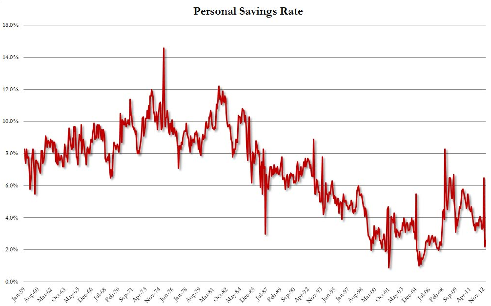 EEUU atraviesa una situación similar a la de la zona euro. La tasa de ahorro de los hogares cayó con fuerza desde principios de año, hasta un nivel de entre el 2% y el 2,6% de su renta disponible, el valor más bajo desde que estalló la crisis de las hipotecas subprime a mediados de 2007 y muy próximo a mínimos históricos. Este descenso coincide con la nueva subida de impuestos aprobada por el Gobierno de Barack Obama el pasado enero con la excusa de esquivar el denominado abismo fiscal.