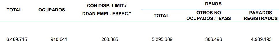De acuerdo con los datos de los SPEE, hay 6.469.715 de "demandantes de empleo", es decir, personas que están apuntadas en sus oficinas. De ellas, algo más de 910.000 están ocupados, por lo que quedan unas 5.560.000 personas que no hay ninguna razón para que no sean considerados "parados". Sin embargo, hay 263.385 personas que salen de la lista por tener "disponibilidad limitada" (es decir, que incluyen algunos requisitos en su solicitud) y otras 306.496 que son "demandantes no ocupados" (normalmente porque están en acciones de formación). Estos 570.000 demandantes de empleo son personas que quieren trabajar y no pueden, por lo que cumplen perfectamente con la definición clásica de parados.