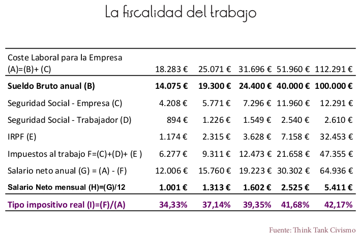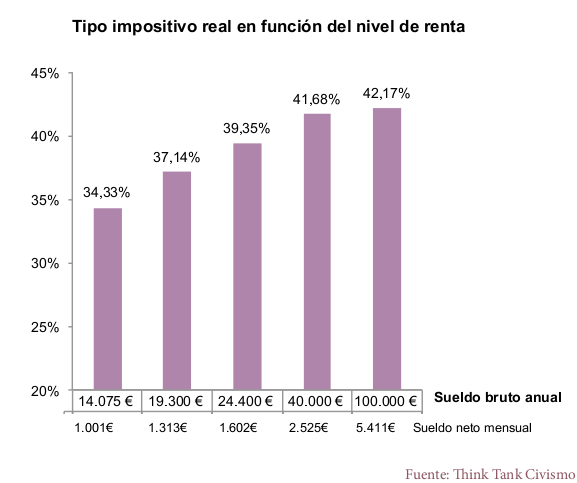 Así pues, entre otros aspectos, se observa que la fiscalidad sobre el trabajo, además se de ser muy elevada (se come entre el 34% y el 42% de la nómina real), es menos progresiva de lo que se presupone inicialmente ya que, si bien los tipos del IRPF van desde el 13% hasta el 56%, el tipo impositivo real (sumando cotizaciones) apenas presenta una diferencia de ocho puntos porcentuales.