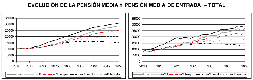 Es decir, mantener el sistema público de reparto condenará a millones de futuros jubilados a cobrar pensiones muy bajas. En concreto, según dicho estudio, la aplicación de la reforma de 2011 junto a la introducción del "factor de sostenibilidad" supondrá reducir entre el 37% y el 60% el importe de las prestaciones en comparación con las actuales. Esto significa que, una vez que estos cambios entren plenamente en vigor, los futuros jubilados cobrarán entre 615 y 390 euros al mes de media (a precios constantes) frente a los 976 euros de hoy. Así pues, su capacidad adquisitiva real se verá reducida casi a la mitad entre 2012 y 2050.
