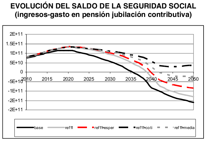 Efectivamente, "si se considera como factor de sostenibilidad la evolución de la tasa de dependencia o la media de esta con la esperanza de vida se observa los buenos resultados en términos de saldo presupuestario, ya que en ambas situaciones el sistema no entra en pérdidas, o éstas son mínimas, a lo largo de todo el periodo proyectado", tal y como resume el siguiente gráfico, aunque a costa, eso sí, de condenar a los futuros jubilados a cobrar pensiones míseras.