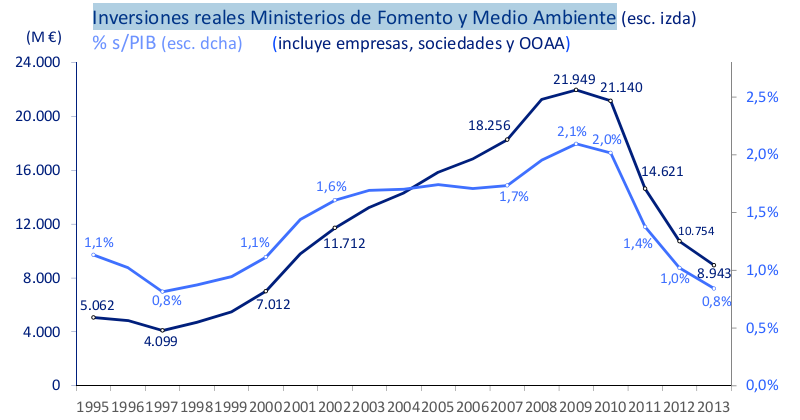 Este anuncio fue acogido con fuertes subidas en Bolsa de las grandes constructoras españolas, lo cual no es extrañar si se tiene en cuenta el desplome de la obra pública en España. La inversión real por parte del Gobierno central, ejecutada a través de Fomento y el Ministerio de Medio Ambiente, apenas superó los 10.700 millones de euros en 2012, menos de la mitad que en 2010, y se preveía una cuantía aún menor para 2013 (8.943 millones).