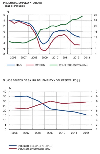 Efectivamente, el empleo descendió un 4,4% interanual en 2012 como consecuencia de la crisis, hasta situarse en una tasa del 55,4% sobre la población activa, casi doce puntos por debajo de su nivel en 2007. El problema, sin embargo, no radica tanto en la destrucción de puestos de trabajo, cuyo ritmo fue similar a ejercicios pasados, como en la dificultad de regresar al mercado laboral, elevando la duración media de la situación de desempleo hasta más de 10 meses frente a los 5 meses de duración en 2007.