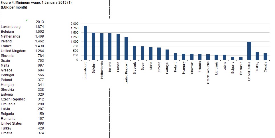 En comparación con otros países europeos (dividido en 12 pagas), el SMI en España asciende a 753 euros al mes en 2013, inferior al de Luxemburgo (1.874,19), Bélgica (1.501,82), Irlanda (1.461,85), Países Bajos (1.456,2), Reino Unido (1.264,25), Francia (1.430,20) o Eslovenia (783,66), aunque superior al de Malta (697,42), Grecia (683,76), Portugal (565,83) o la mayoría de países del Este.