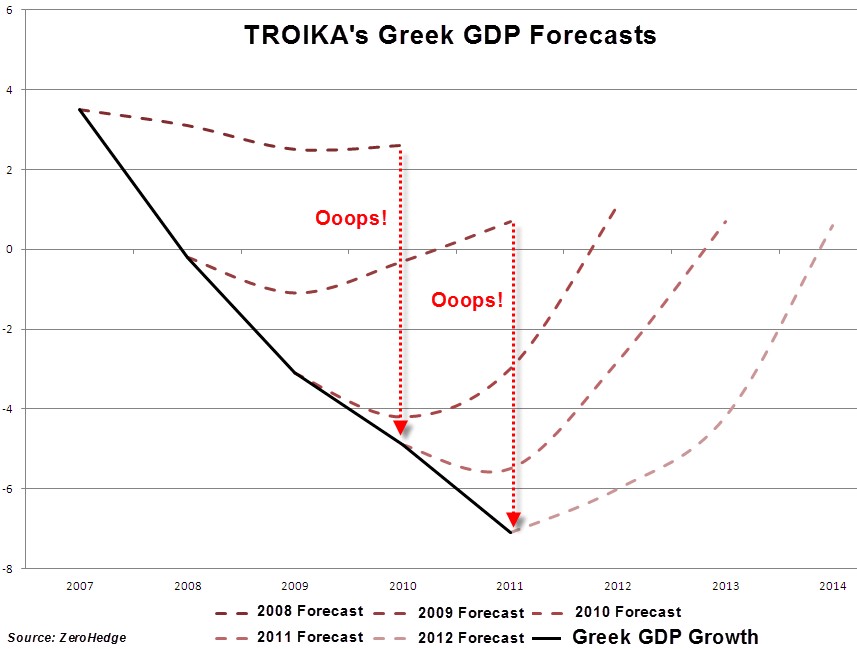 La economía griega cayó en el primer trimestre un 5,6% interanual, situándose en apenas 37.700 millones de euros, el menor volumen trimestral registrado desde el año 2000. Asimismo, el desempleo alcanzó en marzo un nuevo récord al situarse en el 26,8% de la población activa, lo que equivale a 1,3 millones de desempleados. De este modo, la contracción económica está superando, una vez más, las previsiones elaboradas por la troika, tal y como muestra el siguiente gráfico.