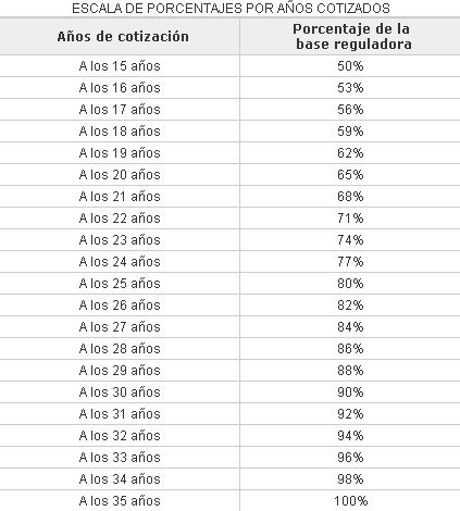 - Si había cotizado 35 años o más cobraba el 100%. Si no, tendría un factor de descuento: el 2% por los diez primeros años y el 3% por los diez siguientes. Por ejemplo: si había cotizado 30 años, cobraba el 90% de su base reguladora (ver cuadro de la derecha).