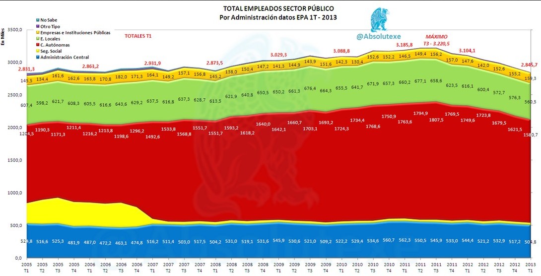 En el empleo público se está notando algo más el ajuste. España contaba con un total de 2.845.800 ocupados en la Administración Pública el pasado marzo, casi 375.000 menos que en el tercer trimestre de 2011, cuando se alcanzó la cifra récord de 3,22 millones. De este modo, el empleo público retrocede a niveles de mediados de 2005, cuando se situó en 2,84 millones, pero todavía está en niveles de burbuja inmobiliaria.
