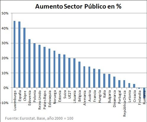 Asimismo, si se amplía la perspectiva histórica se observa que desde el año 2000 el tamaño del sector público español se ha disparado un 45%, frente a la media del 20% que ha registrado la UE-27, tan sólo superado por Luxemburgo.