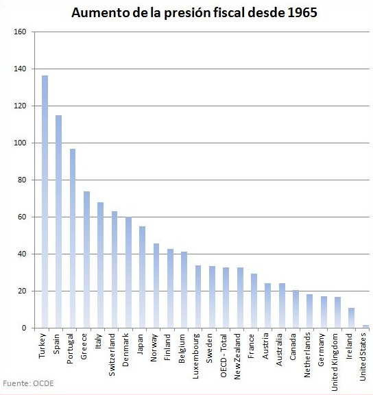 De hecho, si se amplía la perspectiva histórica, España ha sufrido el segundo mayor aumento de la presión fiscal del mundo con respecto al PIB desde 1965, sólo superado por Turquía: un 115%, y llegó a subir un 153% en 2007.