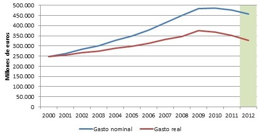 Además, a pesar de estos recortes, centrados en la inversión, el sector público sigue gastando casi 4.000 millones más que en 2008 y hasta 40.000 millones extra si se compara con 2007, en pleno auge inmobiliario. Asimismo, en términos reales (descontando la inflación), el gasto total sigue superando los niveles de 2006, en la cima de la burbuja, y aún excluyendo los intereses de la deuda, el gasto registrado en 2012 seguiría superando el de 2006 en términos reales.