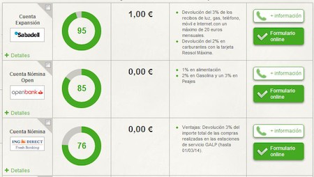Cuentas sin comisiones de servicio, sin coste por las transferencias o por ingreso de cheques, con tarjetas de débito y crédito gratuitas y con alguna ventaja o servicio especial como regalos, remuneración por el saldo de la cuenta o un porcentaje de devolución de recibos.