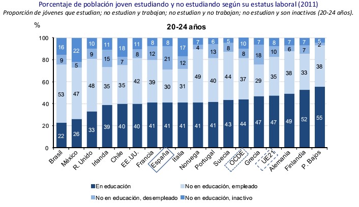 Este dato, sumado al alto índice de desempleo juvenil, constituye el caldo de cultivo idóneo para el desarrollo de los denominados ni-nis. El volumen de jóvenes de entre 20 y 24 años que ni estudia ni trabaja en España se sitúa en el 29%, casi duplicando la media de la OCDE (18%). En concreto, el 21% de los jóvenes españoles no estudia, pero desea encontrar empleo, la tasa más alta de todos los países desarrollados, mientras que el 8% restante se declara totalmente inactivo (no tiene intención alguna de trabajar).