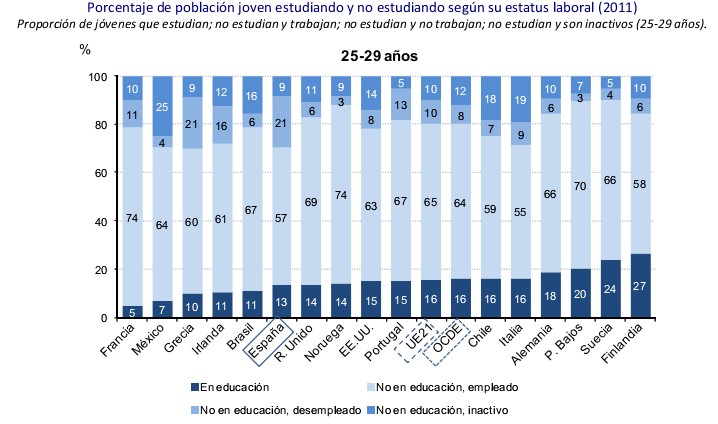 El grupo de jóvenes de entre 25 y 29 años es aún peor, ya que el porcentaje de ni-nis en este caso asciende al 30%, también el más alto de la OCDE, tan sólo igualado por Grecia.